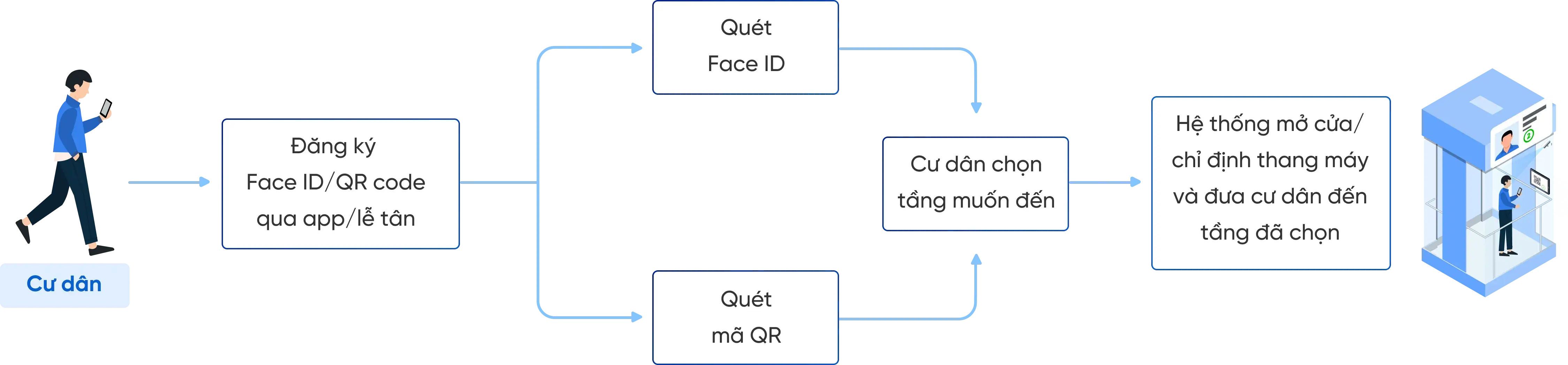 - Hỗ trợ cho cư dân/ khách chọn tầng di chuyển tới