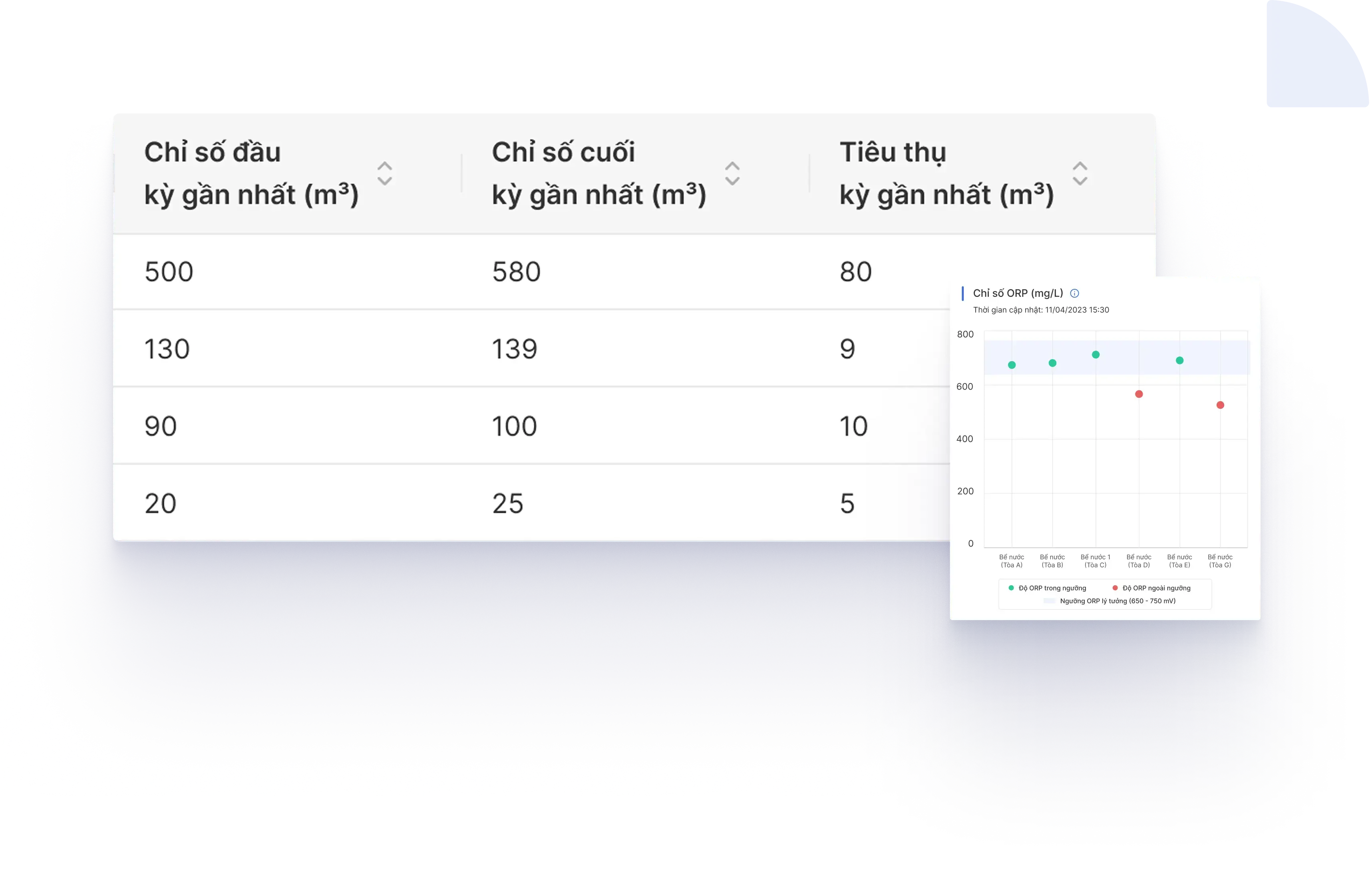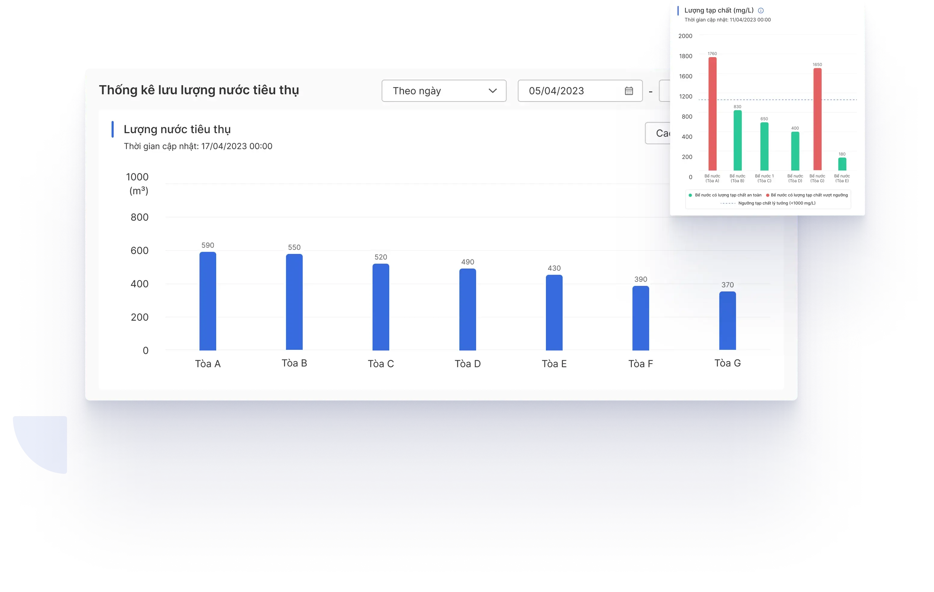 Cung cấp báo cáo thống kê tổng quát và chi tiết lượng tiêu thụ nước mỗi tòa nhà và chất lượng nước dựa trên nhiều chỉ số khác nhau